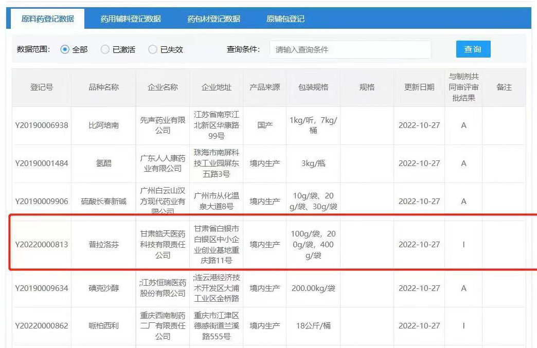 10月27日,甘肅皓天醫藥科技有限責任公司普拉洛芬原料藥完成國家藥品監督管理局藥品審評中心(CDE)登記備案,這是皓天醫藥第一個原料藥品種備案,標志著皓天醫藥正式進入原料藥時代,后續皓天醫藥將有近三十個品種陸續向CDE中心提交備案。